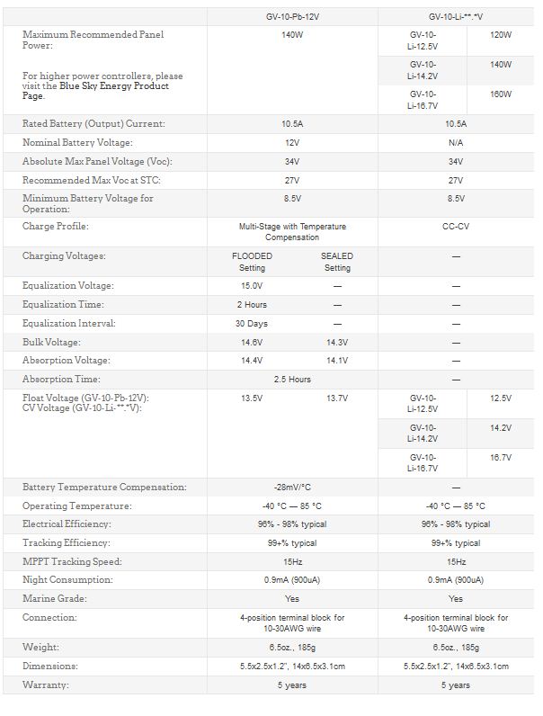 Genasun stocks the GV-10 in a variety of charge profiles for the most common Lithium chemistries and cell configurations. Custom voltages can be programmed at the factory to match the Float Voltage (CV voltage) of your battery. Please select the Custom Voltage option from the drop down, and email support@genasun.com to specify the voltage.