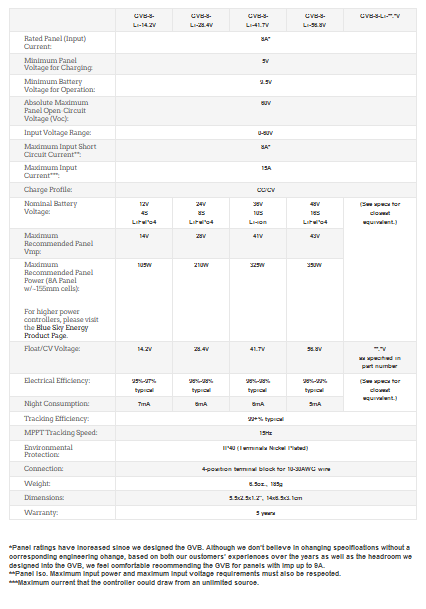 Genasun stocks the GV-Boost in 12V, 24V and 48V nominal charge profile for LiFePO4 batteries. The standard float voltages correspond to 3.55V per cell for compatibility with most batteries (check with your battery manufacturer to be sure). Custom voltages can be programmed at the factory to match the float Voltage (CV voltage) of your battery chemistry. Please select the Custom Voltage option from the drop down, and email support@genasun.com to specify the voltage.