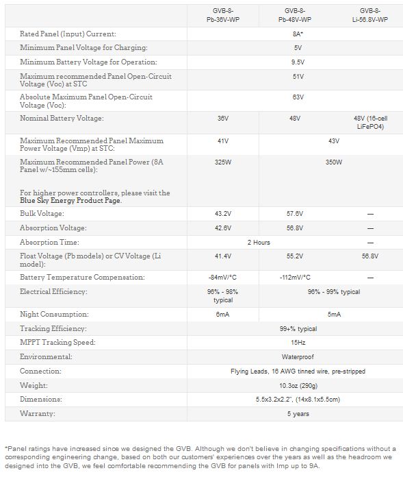 Precise computer controlled charging ensures the optimal charge cycle for your battery. GVB controllers for lithium employ industry-standard Constant-Current Constant-Voltage (CC/CV) charging for widest lithium battery compatibility. The GVB`s float or CV voltage is equivalent to 3.55V per cell, which is suitable for most LiFePO4 battery packs (check with your battery manufacturer to be sure).