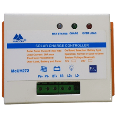 McUH272 is another quality Solar Charge Controller with 20A current capacity for load as well as for charging the battery. It is available in two versions, 12V nominal or 24V nominal. The same controller can be used for different type of batteries by selection on board. The controller can be used for normal and dusk to dawn operation simply by selection on board.