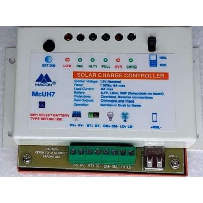 SALIENT FEATURES: McUH7 is Solar Charge Controller with 6A current capacity for load as well as for charging the battery. The same controller can be used for different type of batteries by selection of battery type on board. The controller can be used for normal and dusk to dawn operation simply by selection switch on the top. It has three independent outputs 1.DC out for all types of loads 2.Dimmable output to control the light intensity of LED lights connected and 3.USB out for mobile charging Entire controller has electronic protections against over-load, over-voltage, under-voltage, reverse connections Lightening, reverse flow of current from battery to panel during night Battery status bar graph display for easy diagnosis.