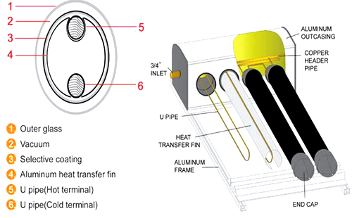 Working principle of CENTURY SUN U pipe solar collector. The CENTURYSUN U pipe solar collector consists of 3 main components: ALL glass vacuum tube, Heat transfer system(solar cycle), Frame. In each vacuum tube there is a U pipe with direct flow-through that is connected to the header pipe inside manifold. This U pipe is seamed in an aluminum heat transfer fin in the interior of vacuum tube that transmits the heat FROM the interior tube to the U pipe. Solar radiation permeates the outer glass tube and is captured on the outside of inner glass tube by highly selective sputter layer. The captured solar radiation is transmitted to flush-contact aluminum shield and then copper pipe filled with heat transfer fluid. The 360°aluminum heat transfer fin assures the fastest energy transfer.