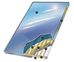 Our flat plate collector`s copper piping is welded using laser technic. to an Aluminum absorber coated with Titanium Oxide coating with solar absorptance of 95%-97% and emittance of 5% - 7% which ensures high efficiency of the solar collector and effective heat conductivity.