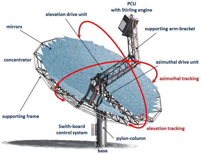 Solar concentrator is a primary solar component of Dish Stirling technology. Prefabricated steel zinc coated parabolic concentrator delivers the sun’s fuel into the focal point where PCU with Stirling engine’s receiver is placed. The concentrator’s area is 57m2. The parabolic concentrator reflects the incoming solar radiation (DNI) through glass mirrors onto a cavity receiver which is located at the concentrator’s focal point. Special proved silver coating glass mirrors reflect more than 94% of the sunlight and mirrors can be easy cleaned. The reflective solar radiation is absorbed by the heat exchanger receiver and thus heats the engine’s working gas Helium. In order to keep constantly the reflected radiation into the focal point during the day, double sun-tracking systems aim the solar concentrator continuously in two axes direct into the sun.
