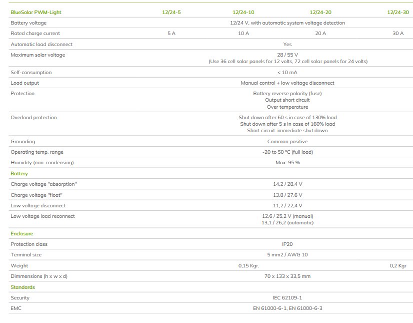 Low cost PWM controller. Internal temperature sensor. Three stage battery charging (bulk, absorption, float). Protected against over current. Protected against short circuit. Protected against reverse polarity connection of the solar panels and/or battery. With low voltage load disconnect output. Optional remote display (20A model only).