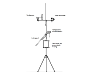 A Solar Farm Weather Monitoring Station is a meteorological station at which common meteorological sensors are mounted on a tripod or lattice or mono-pole mast. The meteorological data are then stored in a data logger and can be transmitted to a remote server automatically. This configuration is used to increase the number and also reliability of real time solar data. The unit can be powered from an AC source (100 to 240 VAC, 50/60 Hz) or a solar panel power system.
