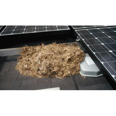 Squirrels and mice are well known for chewing automobile wires and creating nests in engine compartments. With the proliferation of solar – squirrels have taken to the roofs and opened up shop under your solar system. The problem is getting worse and worse as more and more systems are installed. Time is on the squirrels side! In most cases, your system will continue to run without issue even if your wires are damaged. A visual inspection under the panels will reveal nests or hanging wires. If you actually experience a power outage your problem is most likely far advanced and extensive.