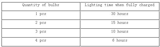 Make the battery fully charged before use is for the first time, when the indicator light is always being on, it shows the charging is complete. Battery capacity indicated by the indicator light, when indicator light twinkle 2 times in 2 seconds, that shows the battery is almost over discharged, at this situation, it can light up two bulbs last 2-3 hours. When the indicator light twinkle 3 times in 2 second, that show the battery is already fully discharged, the system output is cutoff, stop providing lighting and mobile phone charged.