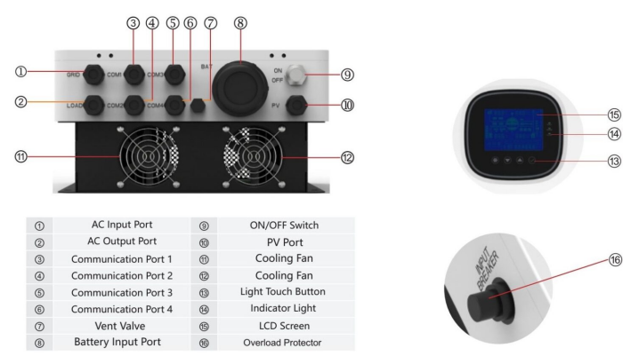 Functional characteristics: It has the function of segmented charging and discharging. Backflow prevention and grid connection function. Insulation resistance and leakage current detection function. Working without battery under special conditions. Lithium battery activation function, which can be triggered by mains or PV. Power saving mode, reduce no-load loss. Four charging modes: PV Only, Mains Priority, PV Priority and PV&Mains hybrid charging. Two output modes: mains bypass and inverter output, with UPS function. 360 °all-round protection. Allow lead-acid battery and lithium battery access. ON/OFF switch controls the inverter AC output.