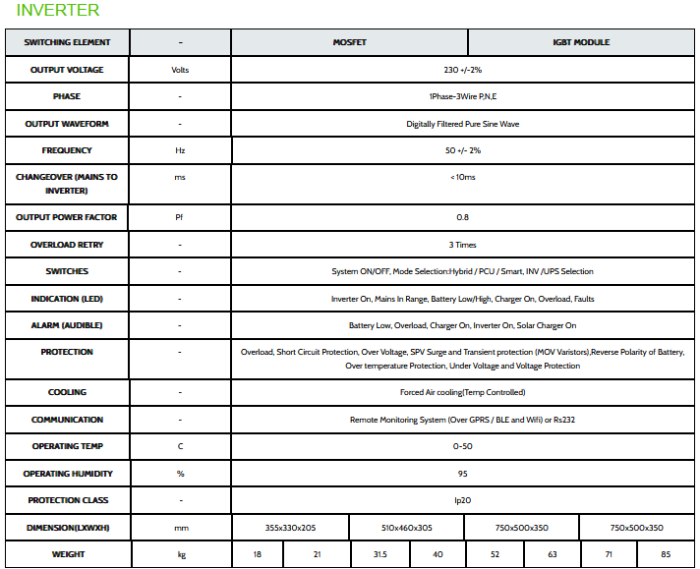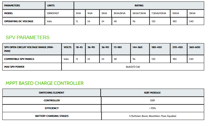 Upto 30% more Efficient because of rMPPT Charge Controller. DSP / Controller based design Pure Sine Wave. Maximum performance to Solar Power. Extensive Electronic Protection. Digital Display. User Friendly :- NLSD, Grid Charging, IT Load, GENSET. (Enable Display by LCD) & Operating Mode (Selectable).