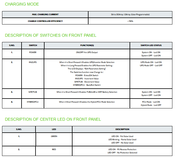 - PV availability, battery charging from solar power indication with solar power priority User friendly, control and selection switches with LCD indication on front panel