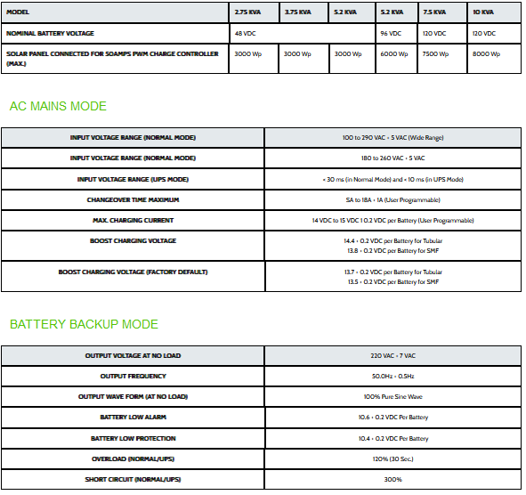 - PV pole reversal protection indication on LCD Deep discharge battery charging from A.C. Mains as well as Solar