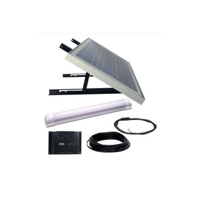 Consists of the following components: 1 solar module 30W, 1 module support structure, 1 charge controller 6A, 1 LED Lighting Unit Super Illu, 1 Load Cable Illu /5 and Installation cable.