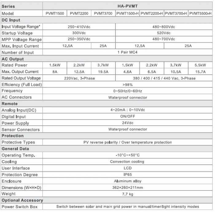 Built-in MPP Tracker. Auto-control and detection by 2 external sensors. Gives maximum torque even at min. sunlight, no need any battery. suitable for water pump, water aerator and factory blower...etc.