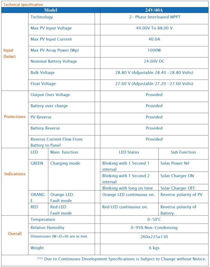 Technology 2- Phase Interleaved MPPT; Max PV Input Voltage 44.00V To 88.00 V; Max PV Input Current 40.0A; Max PV Array Power (Wp) 1000W; Nominal Battery Voltage 24.00V DC; Bulk Voltage 28.80 V (Adjustable 28.40 -28.80 Volts); Float Voltage 27.60 V (Adjustable 27.20 -27.60 Volts).