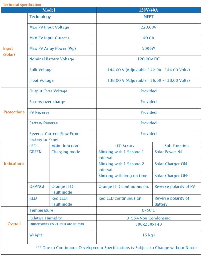 Technology MPPT; Max PV Input Voltage 220.00V; Max PV Input Current 40.0A; Max PV Array Power (Wp) 5000W; Nominal Battery Voltage 120.00V DC; Bulk Voltage 144.00 V (Adjustable 142.00 -144.00 Volts); Float Voltage 138.00 V (Adjustable 136.00 -138.00 Volts).