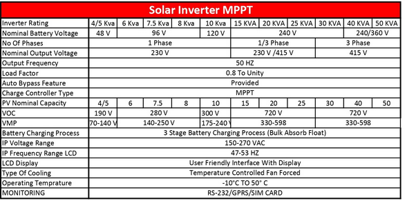 1KW - 10KW (Single Phase / Three Phase). Digital display with fault and energy logging. Remote monitoring over internet and RS232 (Optional). Available in different capacities and battery voltages. Various modes of operation to suit all types of users. Available in 1/2/3/4/5/6/8 and 10 kVA and kW range. Substantially Large LCD to display all parameters(units consumed daily, monthly , yearly etc.).