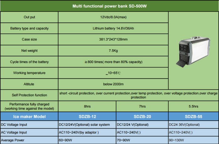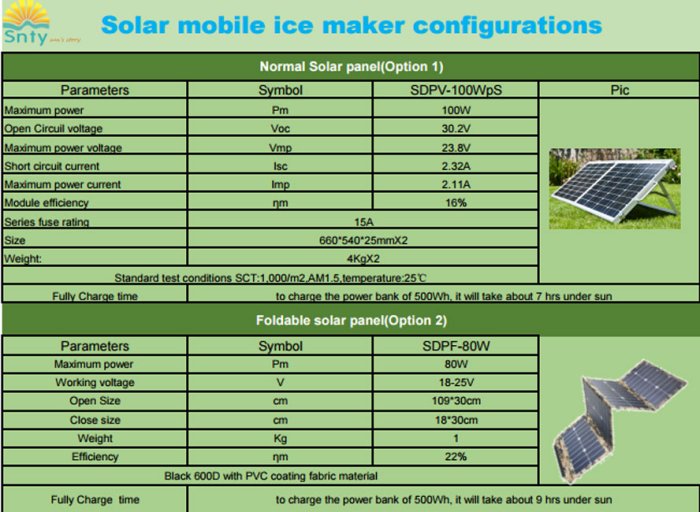 Brand: Sunty-Eco. Power source: Solar power. Power supply kitl: Multifunctional power kit with AC out put(simple. Battery: Lithium battery(lead acid battery system optional. Ice maker capacity: 10/20/55kg/24hrs. Application: outdoor/vehicle fridge/ice.