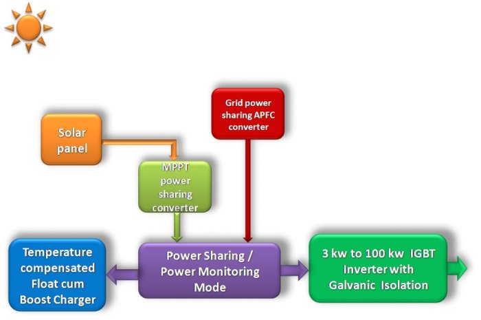 - 100 % Utilization of solar power using Power sharing MPPT Converter and solar PCU.