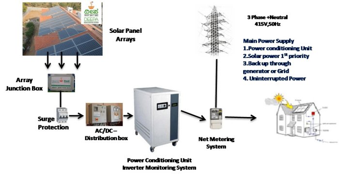 - Solar PCU module utilizes the entire power available from solar and in the event of short-fall in power availability from solar the mains power is drawn to compensate the deficit of power.