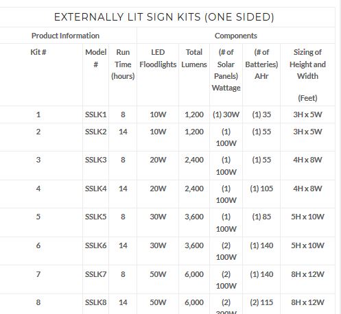 Why engineering is so important in purchasing a solar sign kit? Example, unless you live in the south west USA you do not 6 hours of Peak Sun Light in the worst month of the year to recharge the battery in the system like a lot of one size fix’s all systems tell you so you will have issues a short time after installation when you get shorter days. Our kits are designed based on lowest peak sunlight hours by zone, so talking to one of our Engineers will allow you to get the system that is engineered for your location and last for years.