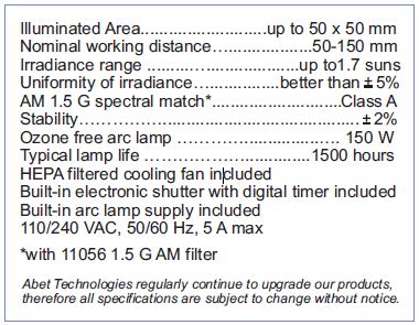 Abet Technologies offers a number of spectral and field size options to match your application. The Sun 2000 family standard offerings range from 50x50 mm to 3500x3500mm 1sun or more uniformly illuminated field versions for Photovoltaic and UV applications.