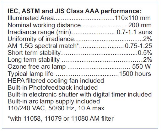 Abet Technologies offers a number of spectral and field size options to match your application. The Sun 3000 family standard offerings range from 50x50 mm to 400x400 mm 1 sun or more uniformly illuminated field versions for Photovoltaic and UV applications.