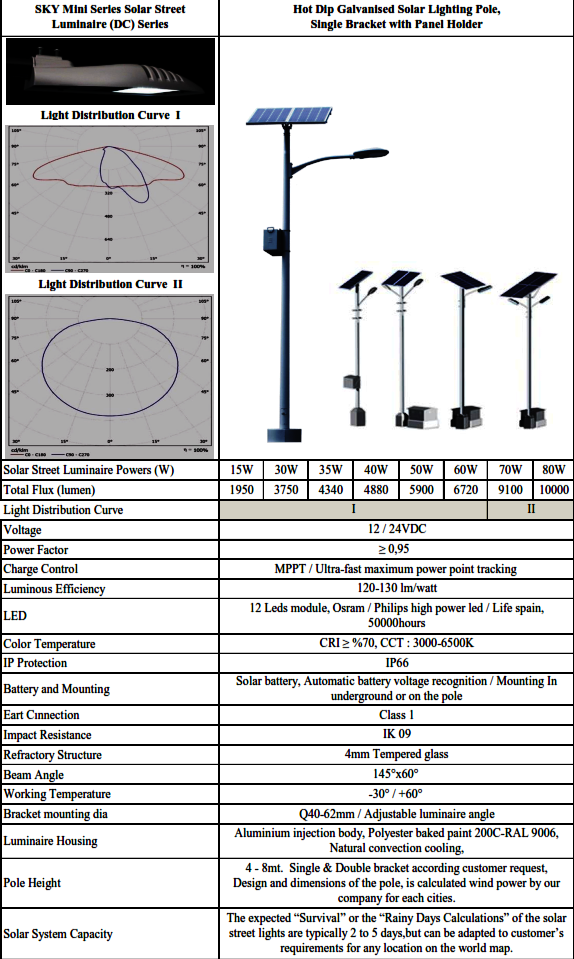 The SKY Mini Series Solar Street Lights are designed for optimal performance in outdoor lighting applications. These lights integrate advanced solar technology to capture solar energy during the day and efficiently function at night. Each unit features high-efficiency solar panels, robust LED light fixtures, and durable batteries, ensuring reliable and sustainable illumination. Their compact design makes them suitable for various installations such as pathways, parks, and small residential streets. The lights are equipped with intelligent sensing technology to adjust brightness according to environmental needs, conserving power and maximizing battery life. The housing is constructed from weatherproof materials to withstand harsh environmental conditions, ensuring longevity and minimal maintenance. Technical installation is straightforward, minimizing the need for extensive wiring and reducing overall setup costs.