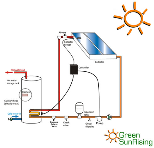 The solar collectors convert solar energy directly into heat, which heat up a water-glycol mixture inside the collectors. This frost-protected water-glycol mixture is circulated via piping through a heat exchanger inside a water storage tank, where the heat energy is transferred into the water inside the tank. Now solar-heated hot water is available for domestic hot water usage, or process heat or any other heat energy requirement.