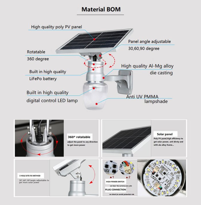 Application for remote area, security area, stand alone area, garden, park, river bank or lake bank. Solar powered. Easy to install. No need wiring. Panel angle and direction both adjustable. Remote control and lighting control both optional.