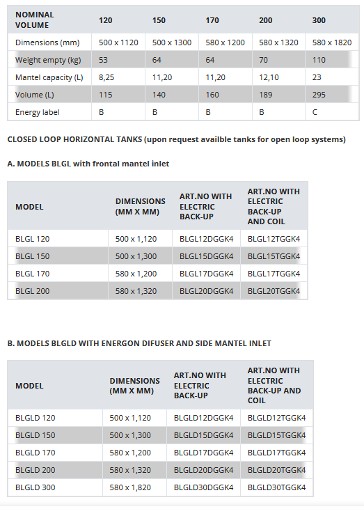 Material: low carbon steel, 3mm thick, protected with double enameling according DIN 4753, baked at 860 C. Heat exchanger: mantel type, from the above material and thickness of 1,5mm.