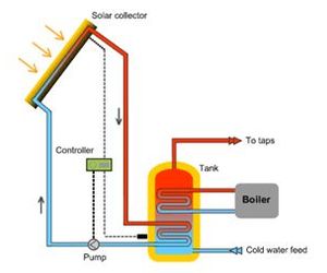 A new circuit containing the solar panel is created. This connects a new twin coil solar cylinder to the solar panel on the roof. A new twin coil solar cylinder is not required on all cases. Use can be made of a seperate pre-heat solar cylinder or an external heat exchanger on the existing cylinder. When the panel is 6oC above the temperature inside the water storage tank the circulation pump will start pumping. The fluid in this circuit is usually anti-freeze (to stop freezing and other associated issues with winter). The fluid will travel up to the panel and the sun will heat it up as it moves through the panel. The heated fluid then flows back to the water storage tank. This process then repeats heating the water storage tank.