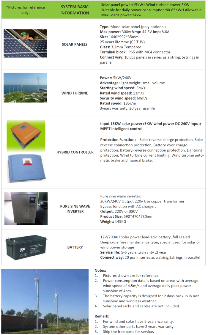 - Off-Grid Hybrid System: solar + wind + hybrid controller + off grid inverter + battery