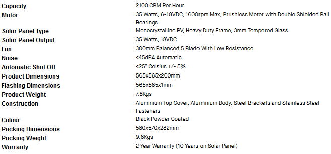 Currently, wind driven “Whirly Birds” can only exhaust around 100CBM (Cubic Metres) of air per hour while the SolarKing 320MM solar fan can pump 2100CBM of air per hour, more than 20x the air movement. This makes the SolarKing far more effective keeping your home or business cooler. You can even use multiple SolarKings on larger or two storey homes.