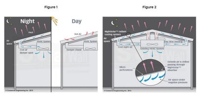 Recent field monitored NightSolar® installations are reporting as much as a 50% overall cooling savings on buildings using existing fans and economizers. And the technology can also be used to still generate daytime heating.