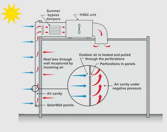 When the sun’s radiation heats the surface of the SolarWall facade, fresh, solar-heated air accumulates on the surface of the collector. The existing HVAC units draw this solar-heated air through thousands of tiny perforations in the SolarWall panels.