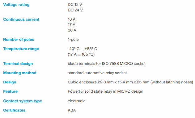 The electronic standard relays type ESR10 Micro are solid state relays for DC 12 V and DC 24 V vehicle applications.