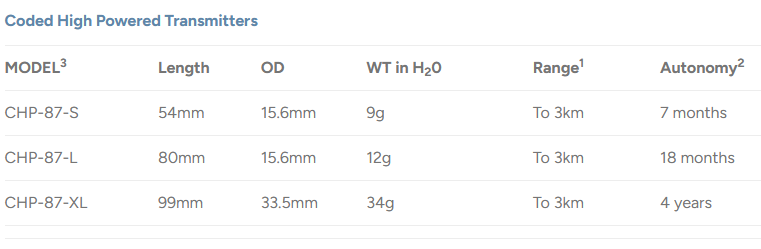 Coded High Power transmitters generate a unique aural sequence, as well as unique combinations of frequency and ping interval allowing detection by both passive and active receivers. The CHP series of transmitters provide maximum detection ranges for use with pelagic studies or in areas of high noise.