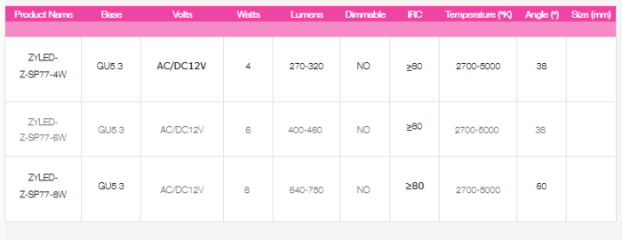 Dimmable NO/YES. Base GU5.3. Volts 12V. Watts 5W. Lumens 400. IRC 80. Temperature (ºK) 2700-5000. Angle (º) 24º/36º/60º. Size (mm) 50*52. Certification UL, CE.