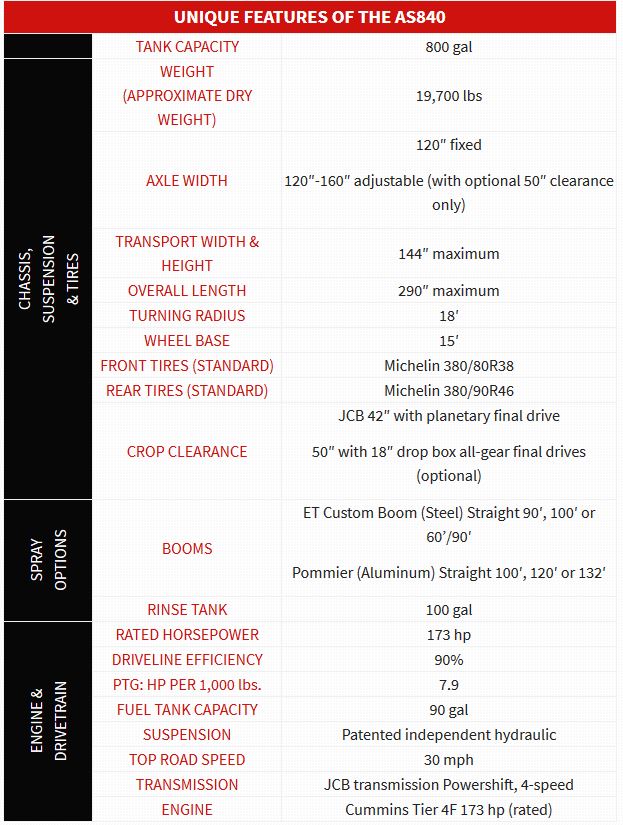 With a 4-speed JCB power shifting transmission and 173 hp Cummins engine, our lightest Apache Sprayer still provides you the power to climb your toughest grades and get you through your most unfavorable ground conditions. Just like all Apache sprayers, the AS840 is fuel-efficient, reliable, and provides leading operator comfort with state-of-the-art noise dampening inside the cab, a positive-position joystick and Bluetooth® capabilities. Get going on the road at speeds up to 30 mph (48.3 kph) and 90 gallons in the tank.