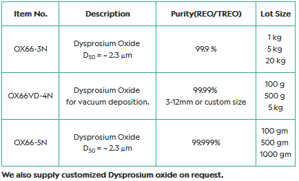 Dysprosium Oxide is the main raw material for Dysprosium Metal which is widely used in Neodymium-Iron-Boron magnets, and also have specialized uses in ceramics, glass, phosphors, lasers, and Dysprosium Metal halide lamps. High-purity of Dysprosium Oxide is used in electronics industry as an antireflection coating in photoelectric devices. Because of dysprosium`s high thermal-neutron absorption cross-section, Dysprosium-Oxide–Nickel cermets are used in neutron-absorbing control rods in nuclear reactors. Dysprosium and its compounds are highly susceptible to magnetization, they are employed in various data-storage applications, such as in hard disks.