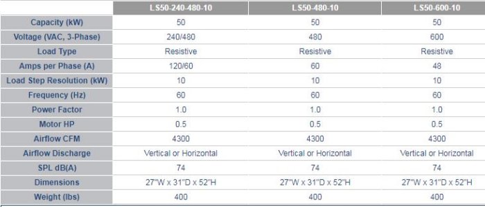 The LS50 comes equipped with an Emergency-Stop push button allowing the operator to take the unit off-line should a critical hard-stop condition occur.  Branch circuit fuse protection provides short-circuit fault protection of all load steps eliminating the potential for catastrophic failure.  Blower On, Motor Overload, Air-Flow Failure, and Over-temperature circuits disable all load steps during a fault condition with operator visual indicators.  Dual Voltage units feature a Wrong Voltage Applied protection circuit which prevents the application of 480 VAC with the Load Voltage Selector switch in the 240 VAC position.  The Load Dump circuit provides the operator visual indication if all load steps have been removed.