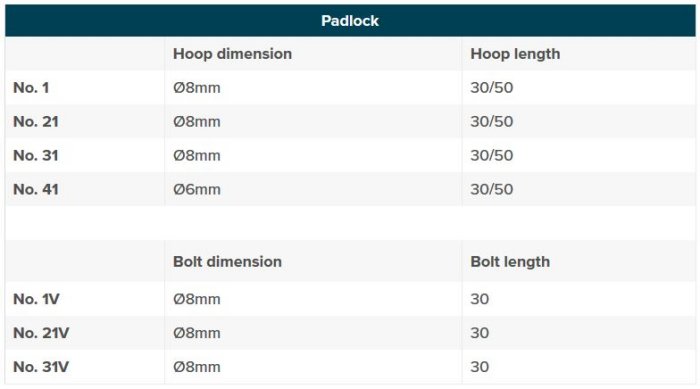 The locks are delivered with a hoop or lock bolt in various sizes.