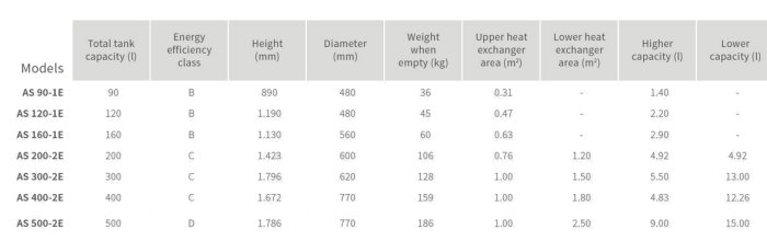The AS 90-1E, AS 120-1E, AS 160-1E, AS 200-2E, AS 300-2E, AS 400-2E and AS 500-2E storage tanks, are designed for hot water production using thermal solar energy. Polyurethane foam insulation. With two coils. To avoid possible corrosion problems, a magnesium anode is fitted, connected to an anode tester for checking the degree of wear. Optionally a 2.5 kW electrical resistance may be supplied.