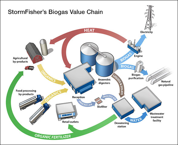 - At StormFisher, we harness the energy potential of the energy in the biogas to create electricity and power the local grid.