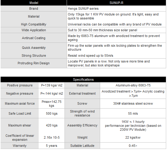 Application: Mounted on tiled rooftop, wavy steel rooftop, and slat rooftop. Designed by Hengs, SUNUP-G & SUNUP-R Solar Mounting Rack has the advantages of high compatibility with any module, extremely durable application, quick and convenient assembly, and as well as complete service and warranty.Professional design and mass production bring price advantage, and further, cut down investment cost for customers.
