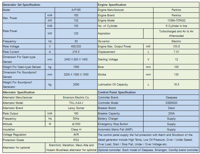 Super Quiet Generator Rate Output 150kVA / 120kW, Standby Output 165kVA / 132kW. The Silent diesel generators with Perkins diesel engine model 1106A-70TAG2 and Leroy Somer alternator model TAL-A44-J produced by Emerson Electric Co., rate output at 150kVA / 120kW, standby output at 165kVA / 132kW with frequency at 50Hz, rate voltage A.C. 400/230V. The diesel generator with Deepsea model DSE6020 controller and Delixi brand 250A breaker. Noise level of the super quiet generator at 70dBA at 7 meters.