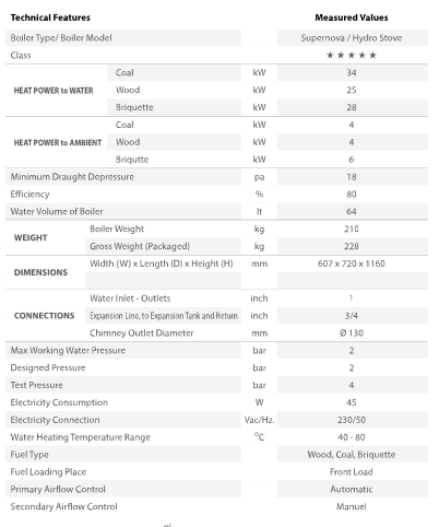 Hydrolic ready system (Circualtion pump, safety valves, thermostad, airflow controller and connections). Easy-move cast iron grate. Cooking surfaces top on stove. Fireplace View. To burn wood, coal and briquette. Thermal safety valve. Semi auto airflow controller ( 40 o C - 80 o C ). Manuel secondary air .