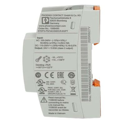 Switch-mode power supply PHOENIX 1088495 – STEP3-PS/1AC/24DC/0.63/PT. Primary switched-mode power supply STEP POWER. Nominal output voltage: 24 V DC. Rated output current: 0.63 A/15 Watt. Nominal input voltage range: 100…240 V AC (1-phase). Efficiency: > 86 % (120 V AC)/> 87 % (230 V AC). Top hat rail mounting. Push-in connection technology. Protection class: IP20.