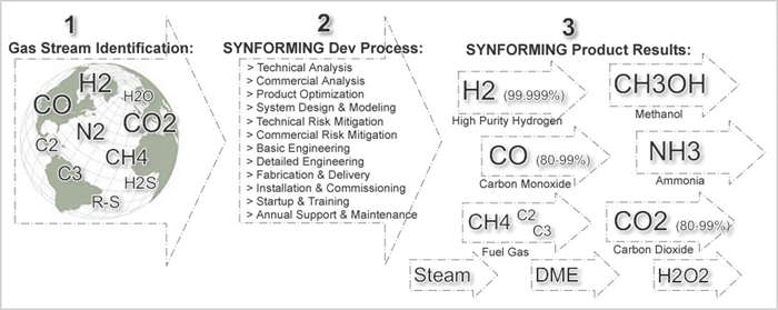 Synforming™is the Perfect Solution for your Syngas, Hydrogen or Carbon Monoxide Process Needs. Gulf Gases SYNFORMING is an exclusive & proprietary technical and commercial development platform which is guaranteed to design & deliver the optimal Gas, Chemical or Fuel Product solution, based on your unique Syngas, Hydrogen or Carbon Monoxide rich feedgas streams.